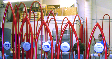 CWA designers, Sivly Ly and Yad Hamawandi inspect the first surfboard installed on March 5, 2009. |
